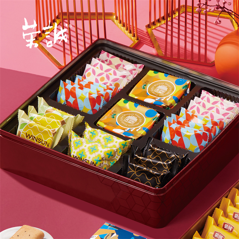 【編 碼】 CGT2208 【條形碼】 6925755534508 【尺 寸】 29.8x29.8x14.3cm 【凈含量】 845g 【規 格】 845gx4盒/箱 【內容物】 100g綜合果仁x1,48g櫻花荔枝味曲奇x1,30g堅果撻x2,35g特色果仁腐乳餅x2,8g果仁曲奇x8,10g香焙杏仁酥x8,30g香妃鳳梨酥x3,30g黑金鳳梨酥x3,13.5g澳式金泊雞蛋卷(咸蛋黃)x9,13.5g澳式金泊雞蛋卷(芝麻原味)x9