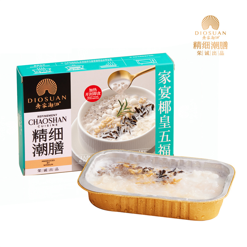 【編 碼】 JXCS2409 【條形碼】 6925755536083 【尺 寸】 16.3x3.2x11.3cm 【凈含量】 225g 【規 格】 225gx24盒/箱 【內容物】 家宴椰皇五福 225gx1